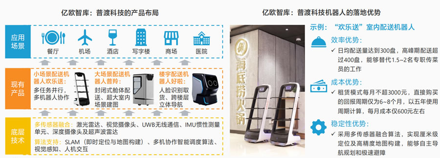 普渡科技綜合了SLAM、智能導(dǎo)航避障、多機(jī)調(diào)度、人機(jī)交互等人工智能技術(shù),為餐廳、酒店、樓宇等廣泛場(chǎng)景提供配送機(jī)器人解決方案,在G動(dòng)態(tài)的商業(yè)環(huán)境下準(zhǔn)確建圖和定位,實(shí)現(xiàn)G效運(yùn)行,優(yōu)化餐飲服務(wù)作業(yè)流程,降低企業(yè)成本。公司產(chǎn)品目前已應(yīng)用于海底撈、巴奴火鍋、旺順閣、美 心、洲際酒店、喜來(lái)登酒店、萬(wàn)達(dá)集團(tuán)等國(guó)內(nèi)知名餐飲、酒店企業(yè),截止2019年6月公司銷售的機(jī)器人已累計(jì)運(yùn)行50萬(wàn)公里。未來(lái)普渡科技的產(chǎn)品 將多面覆蓋迎賓、L位、送餐、回盤等餐飲服務(wù)環(huán)節(jié),并通過(guò)IoT平臺(tái)實(shí)現(xiàn)遠(yuǎn)程的自動(dòng)運(yùn)維和售后,為餐企提供更多面的智慧餐廳解決方案。