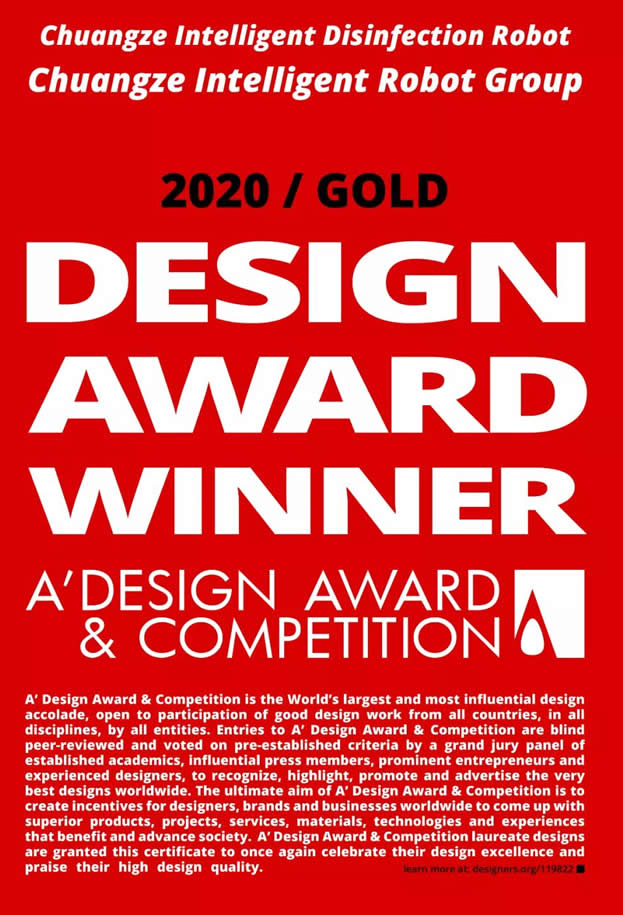 2020年至2021年,意大利A" Design Award設(shè)計大賽共收到來自2萬余件設(shè)計作品,所有參賽作品都是通過來自世界各地的學(xué)者、新聞界人士、設(shè)計師同行和行業(yè)專家所組成的頗具規(guī)模、影響力的設(shè)計獎評審團進行評審。此次,創(chuàng)澤集團智能消毒殺菌機器人在眾多設(shè)計作品中脫穎而出榮獲意大利A"Design Award金獎,代表著設(shè)計界至G榮譽,讓創(chuàng)澤集團的設(shè)計作品閃耀于國際舞臺,同時也證明了創(chuàng)澤品牌在市場上的核心競爭力。