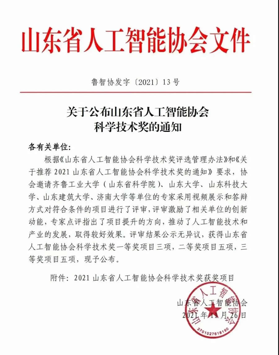 山東省人工智能協會科學技術獎是面向全省人工智能及相關行業,主要獎勵在人工智能L域科學研究與普及、技術創新與開發、科技成果推廣應用和實現產業化方面取得卓著成績的企業。