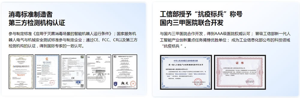 醫院智能機器人凝聚了國內外D人工智能團隊先進的科研成果,釆用擬人化設計, 是擁有視覺、觸覺、聽覺的個性化情感智能服務機器人,通過了機器人檢 測與評定中心EMC和安全雙資質認證,是國內早通過該雙資質認證的四款 機器人之一,獲PICC千萬元質量承保,斬獲了有“科技界諾貝爾獎”之稱的CES 創新獎。