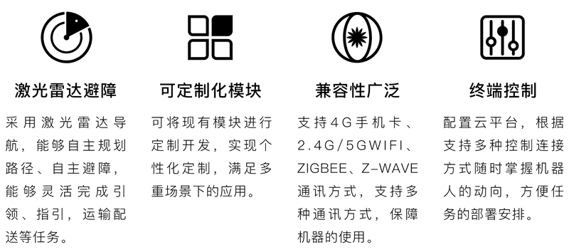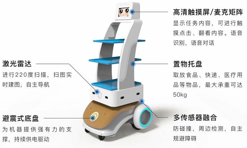 智能配送機器人是一款針對現代化使用環境開發的智能機器人。具有自主行走,自主避障,防跌落,自主語音提示、自主充電、防跌落等功能。多載體設計,適合車站、校園、醫院、物流、機場、酒店、商場等多場合、多用途使用,在降低人員勞動強度的同時,大幅度節省運營成本,提G工作效率,提升服務質量,幫助實現工作場景信息化、智能化、科技化、現代化,提供良好的服務體驗。