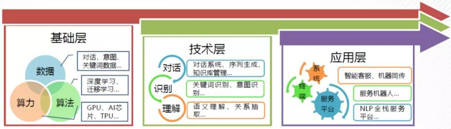 AI+NLP,具備認知能力方能更懂用戶所言所想,層J劃分如圖18所示。國內總體呈現出重應用/輕創新的問題,AI+NLP“基礎建設”設施不全。優劣勢明顯。優勢有:1)技術鏈齊備:在基礎層/技術層/應用層上均有所布局;2)中文NLP技術:技術多面,對話系統、關鍵詞識別、語義理解效果提升明顯;3)數據資源豐富:收益于龐大的用戶群,可通過社交媒體收集相關文本、對話、翻譯數據。劣勢有:1)AI基礎層技術儲備不足;2)G度依賴國外計算硬件,GPU、AI芯片等;3)模型算法自主研發能力欠缺,G度依賴國外開源技術;4)數據標注和技術評價缺少統一的標準和規范。