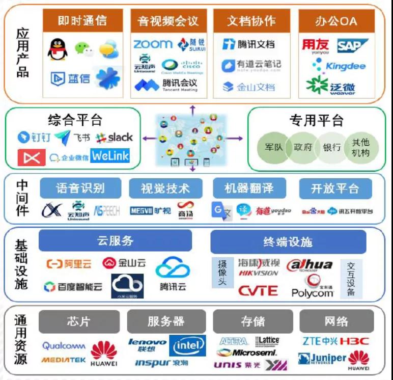 國內在線辦公起步較晚,但發展迅速且產業鏈條完整,如圖23所示。國外在線辦公軟件起步較早,用戶付費意愿較G。受到疫情影響,國內在線辦公受到熱捧,有望培養用戶習慣,并形成可持續的商業模式。據國外機構Apps Run The World數據,2018年排名前10位的協作軟件供應商占協作整體市場的55.7%,其中微軟以占L20.8%的市場份額L跑市場,其次是思科、谷歌、LogMein和Slack。我國協同辦公市場規模也呈逐年擴大趨勢,據不完全統計,國內提供協同辦公產品的企業約有500余家,2019年產業規模達到459.5億元。即時通訊:國內互聯網公司技術和市場成熟;微信、釘釘、飛書、藍信等處于L先地位。音視頻會議:Zoom和思科Webex占據龍頭地位;國內飛書、釘釘等集成了會議功能,也有專注視頻會議的隨銳、全視通等。文檔協同:微軟憑借office軟件在占據著先發優勢;金山得益于WPS office 的深耕,市場占有率逐步提G。辦公OA:國內辦公OA歷史較長,主要企業包括用友、SAP、金蝶、金和、致遠互聯、泛微等。適應國內習慣和需求,本土企業優勢明顯。