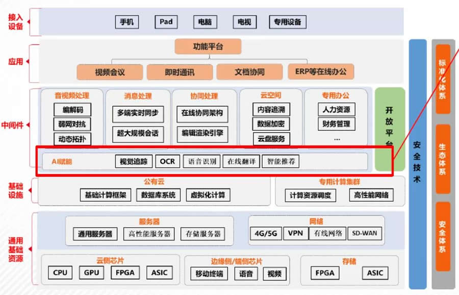 AI賦能協同辦公系統,如圖22所示,提升辦公軟件性能。AI技術主要是讓在線辦公系統更加智能,提供更出色的用戶體驗。網絡質量預測。用于動態調整網絡拓撲、編碼方式等,保證通信質量。人臉識別技術驗證身份,提升會議系統的安全性。對視頻質量進行動態改善,提升交流體驗。利用語音識別和翻譯技術,實現會議字幕生成和翻譯。AI在協同辦公軟件中可發揮的作用有待進一步挖掘。