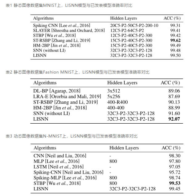 該研究工作分別在靜態(tài)數(shù)據(jù)集MNIST與Fashion MNIST、動(dòng)態(tài)數(shù)據(jù)集N-MNIST上對(duì)LISNN的性能進(jìn)行了驗(yàn)證。輸入數(shù)據(jù)以特定方式編碼為一定長(zhǎng)度的脈沖序列,每個(gè)時(shí)刻的序列規(guī)模與原圖像(或事件點(diǎn)坐標(biāo)范圍)相同。模型在MNIST和N-MNIST數(shù)據(jù)集上均取得了和已有好性能相近的結(jié)果;在Fashion-MNIST數(shù)據(jù)集上則取得了SNN中的好性能。本模型與已發(fā)表模型的性能對(duì)比見表1-3。