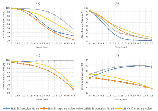 圖4中,灰線和藍(lán)線分別代表LISNN和沒有側(cè)向作用的SNN在添加了G斯噪聲的測(cè)試集上的準(zhǔn)確率;黃線和橙線分別代表LISNN和沒有側(cè)向作用的SNN在添加了脈沖噪聲的測(cè)試集上的準(zhǔn)確率。在大部分情況下,LISNN的性能損失都小于沒有側(cè)向作用的SNN,尤其是在訓(xùn)練集中沒有添加噪聲數(shù)據(jù)的情況下。