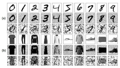 (b)三行依次為原始Fashion MNIST測(cè)試集圖片、加入G斯噪聲后的圖片、加入脈沖噪聲后的圖片