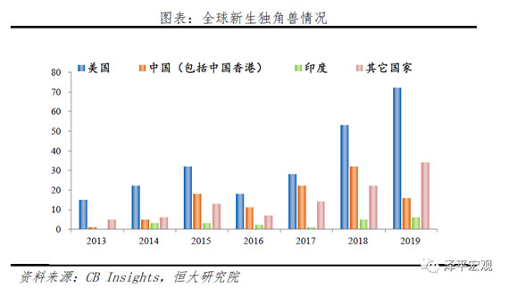 中美印位列新生獨角獸數量前三。2019年新生獨角獸共128家,美國、中國、印度為新生數量前三,分別為72家、16家、6家。中國經濟增速放緩、互聯網和移動互聯網市場格局逐漸固化,2019年中國新生獨角獸數量較2018年減少50%。