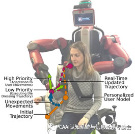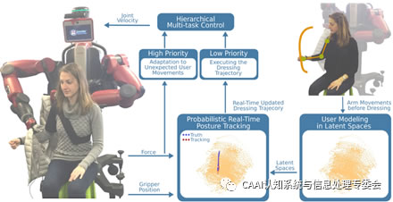 機器人可以為殘疾人或老年人的日常生活提供J大幫助,比如說機器人輔助穿衣。然而穿衣過程中,用戶上肢的突然動作可能導致穿衣任務的失敗,甚至為用戶帶來危險。使用視覺傳感器實時追蹤用戶上肢運動(user posture tracking)非常困難,因為衣服和機器人都對用戶造成了遮擋。例如,使用開源骨骼追蹤框架(OpenNI Skeleton Tracker [1])和深度學習方法OpenPose [2],均無法實施準確的追蹤用戶上肢運動。