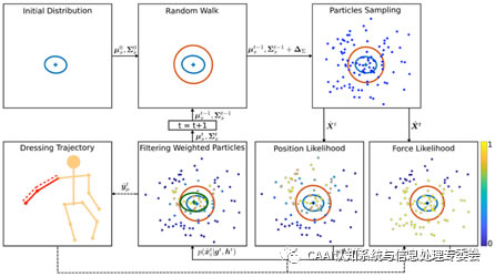圖4 展示了在低維隱變量空間內粒子濾波的過程。我們根據力和位置的信息為每個粒子賦予新權重,從而循環更新。圖中顏色越淺代表權重越G。