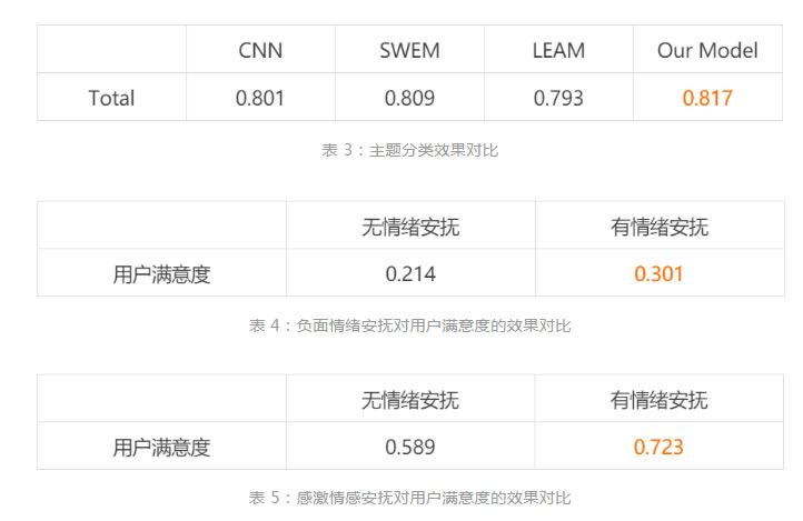 表 2 給出了針對需要安撫情感的分類模型效果對比,包括每種情感類別的單獨效果以及終的整體效果。表 3 給出了針對主題的分類模型效果對比。表4給出了針對幾種負面情感,增加了情緒安撫之后,用戶滿意度的提升效果。表 5 給出了針對感激這種情感,增加了情緒安撫之后,用戶滿意度的提升效果。 表 3:主題分類效果對比 表 4:負面情緒安撫對用戶滿意度的效果對比 表 5:感激情感安撫對用戶滿意度的效果對比