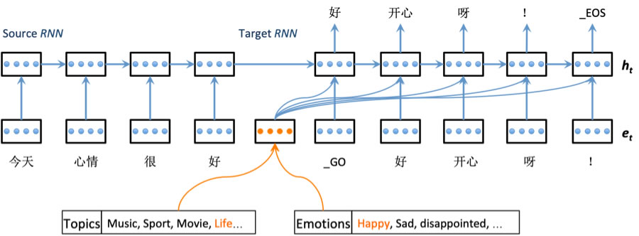 圖 6 中給出了智能客服系統中的情感生成式語聊的模型圖。圖中,source RNN 起到了編碼器的作用,將源序列s映射為一個中間語義向量 C,而 target RNN 作為解碼器,則能夠根據語義編碼 C 以及我們設定的情緒表示 E 和主題表示 T,解碼得到目標序列 y。此處的 s 和 y,分別對應圖中由詞語序列組成的“今天心情很好”和“好開心呀!”兩個句子。