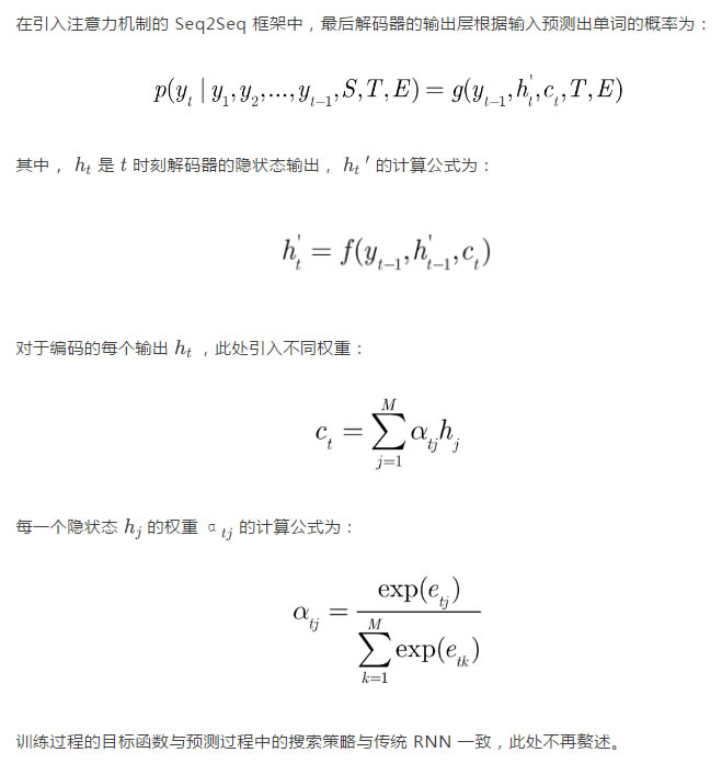 通常,為了使解碼器能夠保留來自編碼器的信息,編碼器的后一個狀態將作為初始狀態傳遞給解碼器。同時,編碼器和解碼器往往使用不同的 RNN 網絡用以捕獲問句和回復句不同的表達模式。具體的計算公式如下: