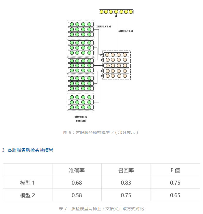 另外,模型 2 將當前客服話術及其上下文的編碼結果,再次按照前后順序進行整體的正向 GRU 或 LSTM 編碼作為終的語義特征。模型結構的部分展示如圖 9 所示。模型 1 與模型 2 相比,模型1會更加凸顯當前待檢測話術的語義信息,而模型 2 則更加多得體現整體上下文的序列化語義信息。