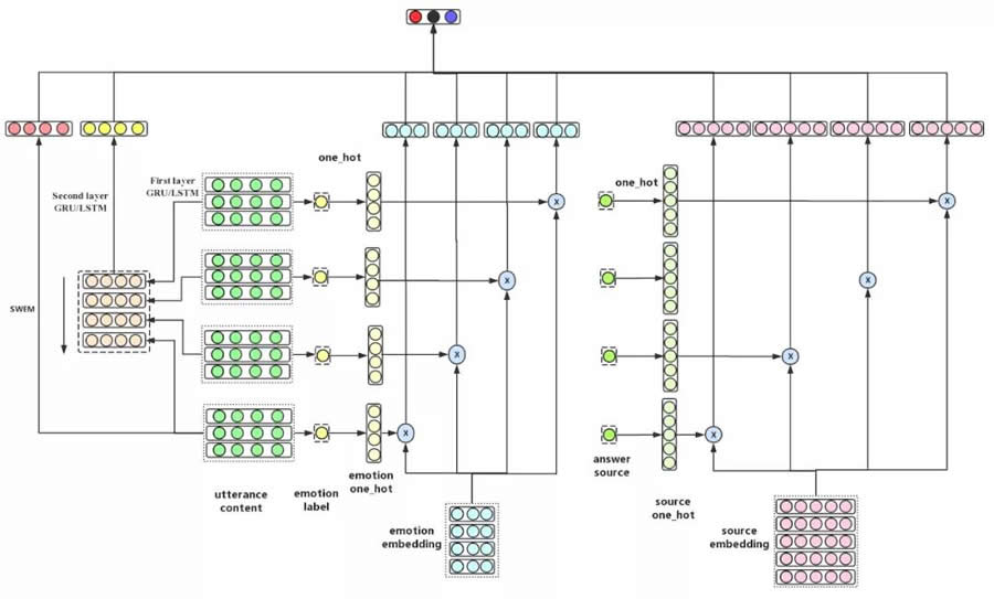 在本文中,我們提出了結合語義信息特征、情緒信息特征和答案來源信息特征的會話滿意度預估模型。模型充分考慮了會話中的語義信息,并且使用了數據壓縮的方式將情緒信息和答案來源信息進行了充分表達。模型結構如圖 10 所示。