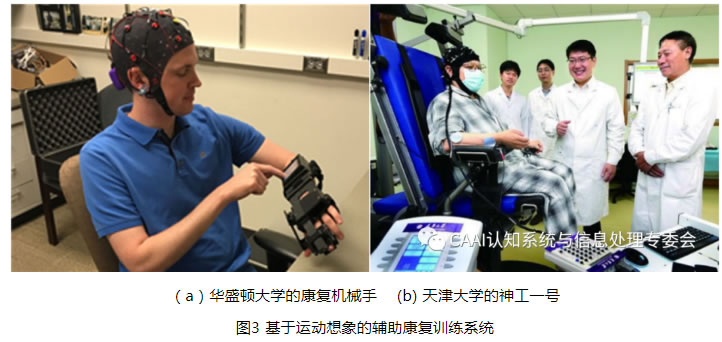 美國凱斯西儲大學Daly等通過運動想象檢測大腦皮層神經元的激活情況,表明BCI系統(tǒng)能有效地輔助患者誘發(fā)腦功能重塑并降低大腦皮層的異常激活。即主動的運動感知和被動外部設備相結合形成主被動康復訓練系統(tǒng),將有利于受試者肢體的運動功能康復[4]。華盛頓大學Bundy等通過健側手部動作運動意圖輔助患者控制外骨骼機械手,實現(xiàn)了患者在日常生活中執(zhí)行康復訓練[5],如圖3(a)所示。主被動康復訓練系統(tǒng)不僅能輔助正常受試者康復訓練,而且在患者的康復訓練中也取得了一定的進展。德國圖賓根大學VárkutiB等通過運動想象控制MIT-MANUS機器人輔助患者上肢執(zhí)行康復訓練,結果表明上肢運動功能得到明顯改善[6]。如圖3(b)所示天津大學明東教授團隊通過患者肘關節(jié)屈-伸運動想象控制“神工一號”康復機器人輔助肘關節(jié)的康復運動,增強了康復訓練效果。西安交通大學徐光華教授團隊研究了目標誘導的運動想象刺激范式,證明了有目標導向的運動想象增強了對大腦皮層的激活并改善運動想象的能力[7]。韋恩州立大學Whyte等進一步提出了規(guī)范康復訓練體系可幫助患者主動參與康復訓練[8]。