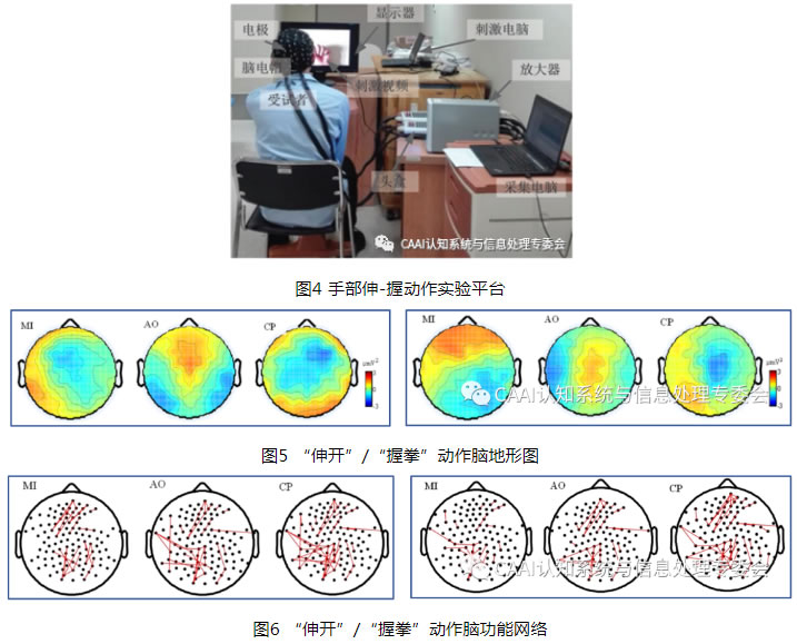 為了提G運動想象動作與所需要的康復肢體的直接相關性,本課題組設計了手部伸-握動作直接相關的運動想象和動作觀察相結合的復合范式實驗,以實現(xiàn)更好的手部主動康復。運動想象是讓受試者去想象某一個動作,不用產生任何肌肉活動,調動主觀意念在心理上反復模擬或復現(xiàn)相應動作。動作觀察是讓受試者觀看日常生活手的基本動作(如抹桌子、洗衣服等視頻動作),然后盡力去模仿視頻中所出現(xiàn)的動作。通過ERSP(時間相關譜擾動)、腦地形圖和腦功能網絡計算分析了伸-握動作運動想象和動作觀察對大腦皮層的激活規(guī)律。