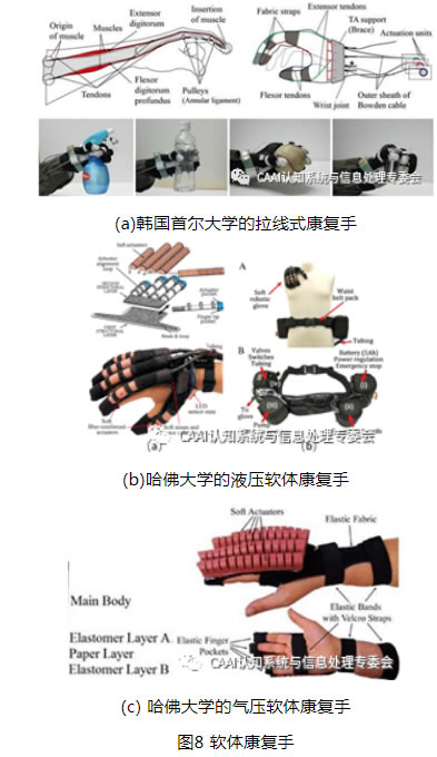 現(xiàn)有的軟體康復手大多采用拉線驅動、液壓驅動和氣壓驅動。韓國首爾大學的HyunKi In等人[10]設計了如圖8(a)所示的一種拉線驅動的軟體康復手Exo-Glove,在柔性織物手套的指套手背側和手掌側鋪設繞性金屬絲,驅動電機拉動繞性金屬絲,即可輔助手指的完成屈曲和伸展動作,指捏力量為20N,掌握力量為40N,驅動控制系統(tǒng)與手套本體分離使手套僅重196g,大可以抓握直徑76mm的物體。哈佛大學的Panagiotis等人[11]設計了如圖8(b)所示的一款重量為285g的輔助患者抓握的液壓驅動的軟體康復手,并配備了一個重量為3.3kg的液壓驅動控制便攜式腰包。該液壓軟體康復手的軟體驅動器,由纖維增強材料制作的成型彈性腔與約束線、限制層組合制作,在增壓時可完成屈曲、扭轉、伸長等運動,可以輔助手指完成主動屈曲運動和被動伸展運動。哈佛大學的Stacey Lyne等人[12]利用3D打印模具進行軟材料澆鑄制作氣動軟體驅動器,從而制作成如圖8(c)所示的重量約為160g的 PneuNet 軟體康復手。該氣動軟體驅動器在靠近手背側嵌入彈性模量大的限制層,使驅動氣腔在增壓時向彈性模型大的一側彎曲,實現(xiàn)輔助手指主動驅動運動,氣壓為0.45Mpa時指尖壓力為1.2N。