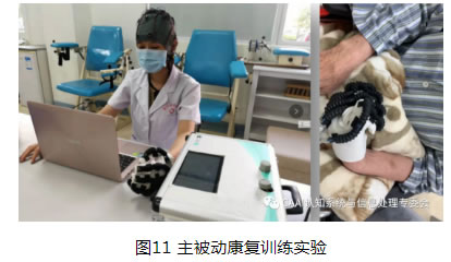 手部主被動訓練系統(tǒng)可分為主動康復和被動康復兩個部分。在主動康復訓練中,對于患者主動意圖的感知有兩種:一種是在多范式刺激大腦皮層的基礎上,從增強的EEG 中直接提取單側手部伸-握動作精細意圖的EEG 特征,實現(xiàn)對受試者手部動作的精細意圖感知;另一種是發(fā)揮不同模式如EEG、眼電圖(Electrooculogram,EOG)和肌電圖(Electromyogram, EMG)模式的優(yōu)勢,構建多模式協(xié)同控制策略以產生更多的控制指令。在被動康復訓練中,通過主動運動意圖產生的控制指令或直接輸入指令對軟體康復手進行驅動控制,實現(xiàn)軟體康復手輔助手部執(zhí)行康復訓練或進行日常生活。實驗驗證了系統(tǒng)輔助患者在線被動康復訓練,通過正常受試者在線控制康復機械手輔助執(zhí)行伸-握動作,其平均正確率達到92.71%,基本滿足主被動康復訓練的要求,也提升了主被動康復系統(tǒng)的實用化水平。同時,該手部主被動康復訓練系統(tǒng)成功在多家醫(yī)院和兩家企業(yè)進行康復試用。