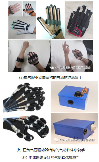 鑒于拉線式軟體康復手的驅動傳動系統(tǒng)較復雜、對手的壓迫感較強,液壓軟體康復手重量較大、有泄露污染的風險,本課題組對重量更輕、成本更低、驅動控制較為簡單的氣動軟體康復手展開了研究。前期,本課題組利用限制層和纖維約束的單氣腔驅動器結構設計,并基于電容變化原理利用介電彈性材料制作柔性傳感器,設計了如圖9(a)所示的集成柔性傳感器的氣動軟體康復手,改變限制層方向,可以輔助人手分別實現(xiàn)主動伸展和主動屈曲運動,并檢測手指彎曲角度進行康復效果評估[13]。但是該氣動軟體康復手無法輔助人手實現(xiàn)拇指的內收/外展運動,也無法同時實現(xiàn)伸展/屈曲運動的雙向主動訓練。為此,本課題組又利用波紋管制作的正負氣壓驅動器制作了如圖9(b)所示的氣動軟體康復手。該氣動軟體康復手僅有149克,采用開放式手套,通過欠驅動可以輔助手指實現(xiàn)伸展/屈曲運動和拇指的內收/外展運動的主動訓練;配套的便攜式氣動箱體積小、重量輕,G級康復版氣動箱可調節(jié)六個輸出氣路的壓力和流量;實驗表明,伸展/屈曲驅動器在伸展時的大作用力為4.6N,內收/外展驅動器在內收時大作用力為8.1N。當前,該氣動軟體康復手的驅動器設計、控制設計仍在不斷地進行優(yōu)化。