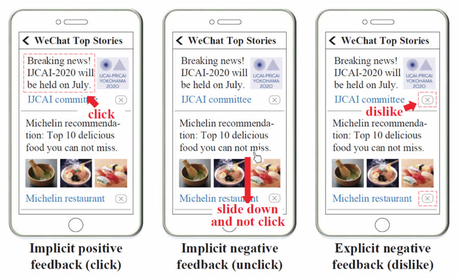 推薦系統(tǒng)在日常生活中被廣泛使用,為用戶獲取信息與娛樂提供便利。推薦系統(tǒng)算法往往基于用戶與系統(tǒng)的交互,這些交互行為可以大致分為以下兩類:顯式反饋與隱式反饋。顯式反饋從用戶對于物品的直接態(tài)度中獲取,例如評論中的一星到五星,或者微信看一看系統(tǒng)中的“不感興趣”按鈕。這類反饋能夠直接表達用戶的正向以及負(fù)向偏好,但是這類反饋的數(shù)量往往不多。隱式反饋從用戶的行為中間接獲得,例如用戶的點擊/不點擊行為。這些信息在推薦系統(tǒng)中往往是海量的,但是這些信息有著較多噪聲(用戶點擊的并不一定是他真正喜歡的)。另外,隱式反饋通常是以正反饋的形式出現(xiàn),推薦中的隱式負(fù)反饋存在巨大噪聲(未展現(xiàn)信息或者未點擊信息并不一定意味著用戶不喜歡這些內(nèi)容)。