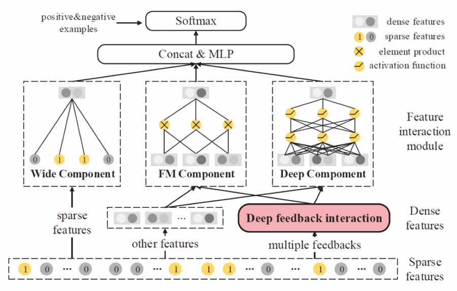 DFN模型主要分為三個階段:首先,deep feedback interaction module以用戶的多種反饋行為作為輸入,輸出用戶的反饋特征。然后,F(xiàn)eature Interaction Module進一步考慮用戶的其它特征和物品特征,使用FM、Deep和Wide層進行特征交互。后,輸出層使用CTR作為訓(xùn)練目標(biāo)。圖2給出了DFN的整體結(jié)構(gòu)。