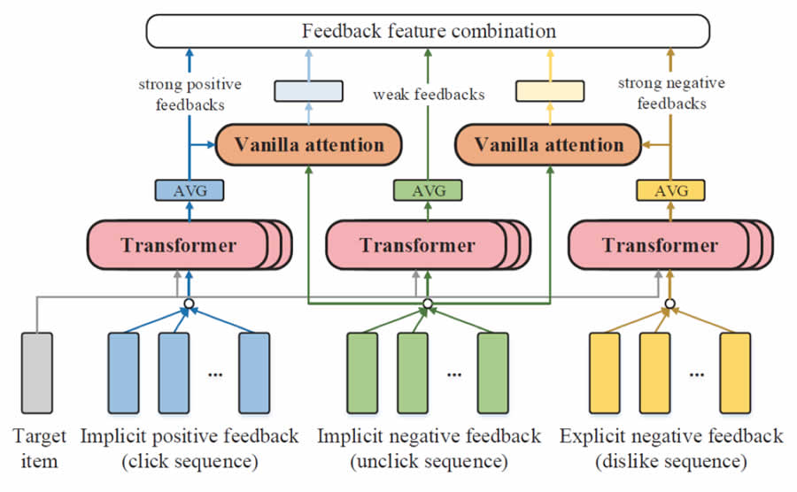 1、作者D一次融合隱式正反饋(點擊行為)、隱式負(fù)反饋(曝光但未點擊的行為)、顯式負(fù)反饋(點擊不感興趣按鈕行為)和它們之間的交互信息進行用戶行為建模;