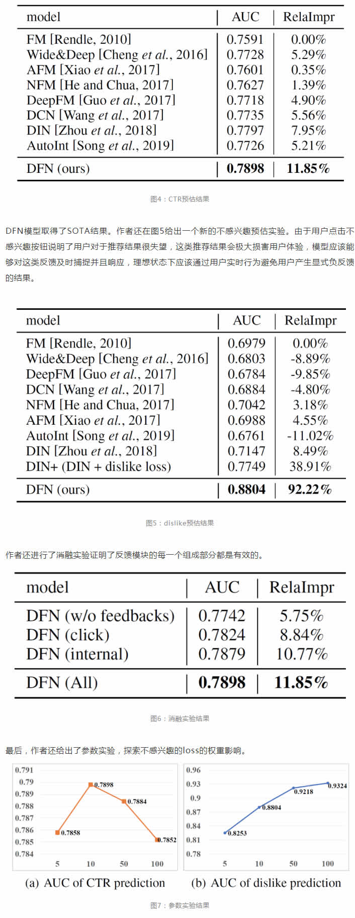 DFN模型使用了internal feedback interaction component抓住用戶行為序列中的細粒度的行為級別的交互,然后通過external feedback interaction component,使用準(zhǔn)確但稀少的隱式正反饋和顯式負(fù)反饋作為監(jiān)督,從噪音較多的隱式負(fù)反饋中進一步抽取用戶的正負(fù)反饋信息。在實驗中,作者基于微信看一看的數(shù)據(jù),進行了豐富的離線和在線實驗,模型與baseline相比均取得顯著提升。