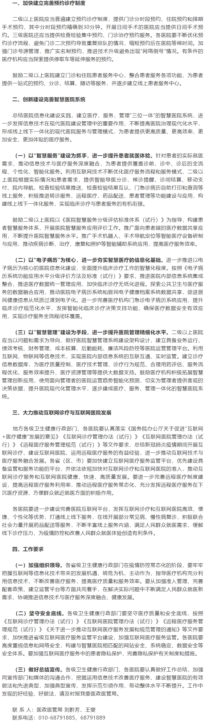 近年來,為改善人民群眾就醫(yī)體驗,各地不斷推進(jìn)以電子病歷為核心的醫(yī)院信息化建設(shè),創(chuàng)新發(fā)展智慧醫(yī)院、互聯(lián)網(wǎng)醫(yī)院,建立完善預(yù)約診療制度等改善醫(yī)療服務(wù)工作。新G肺炎疫情期間,智慧醫(yī)院和互聯(lián)網(wǎng)醫(yī)院建設(shè)、預(yù)約診療等改善醫(yī)療服務(wù)成果,在應(yīng)對疫情、滿足人民群眾就醫(yī)需求等方面發(fā)揮了積J作用。為持續(xù)鞏固疫情防控成果和改善醫(yī)療服務(wù),加快推進(jìn)線上線下一體化的醫(yī)療服務(wù)新模式,不斷增強(qiáng)人民群眾就醫(yī)獲得感,現(xiàn)就進(jìn)一步建立完善預(yù)約診療制度,加強(qiáng)智慧醫(yī)院建設(shè)等有關(guān)工作通知如下: