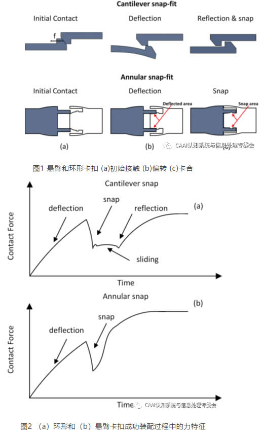 零件在不同的裝配階段產生的作用力可用于描述過程狀態。圖2所示的兩種卡扣的力特征圖具有不同的形狀,可用于及時識別裝配過程的完成情況。在這兩種情況下,物體的偏轉都會產生一個恒定的力,一旦部件的力消失,力就會急劇下降,當兩部分鎖定在一起時,力就會增大。懸臂卡扣在鎖定之前,兩個部件相互滑動,產生一個恒定的摩擦力,該摩擦力由于部件的材質屬性造成的力載荷不同而變化。環形卡扣則不存在滑動。力信號的確切形狀取決于連接部件的機械性能和卡扣類型。環形和懸臂是兩個J端情況,環形卡扣是在恒定的力載荷下,而懸臂卡扣在咬合后載荷消失。