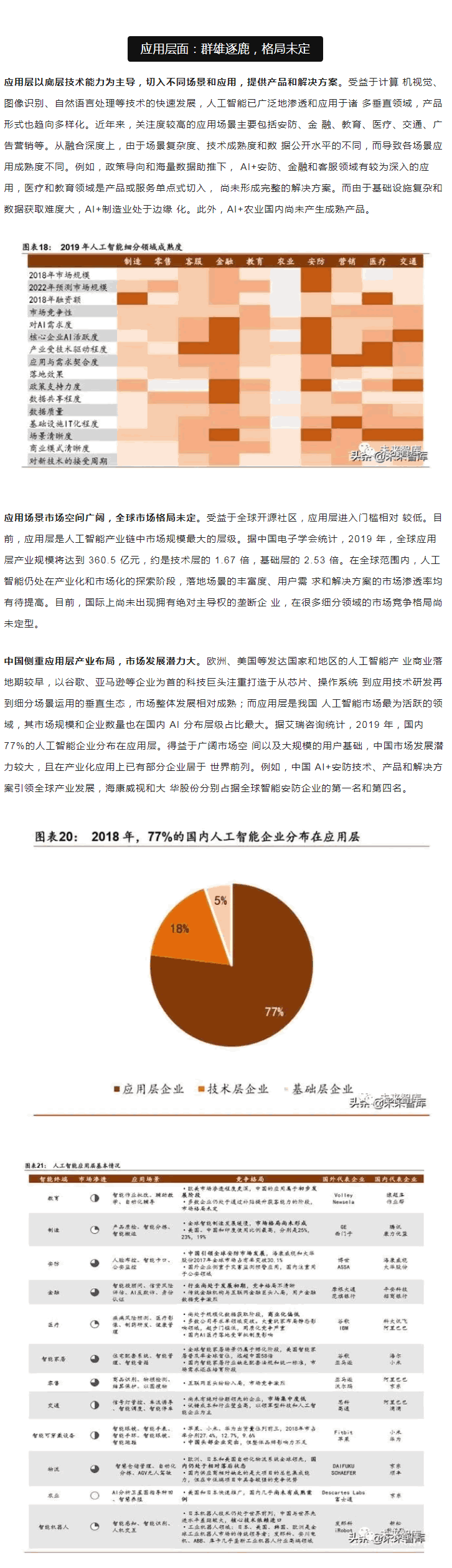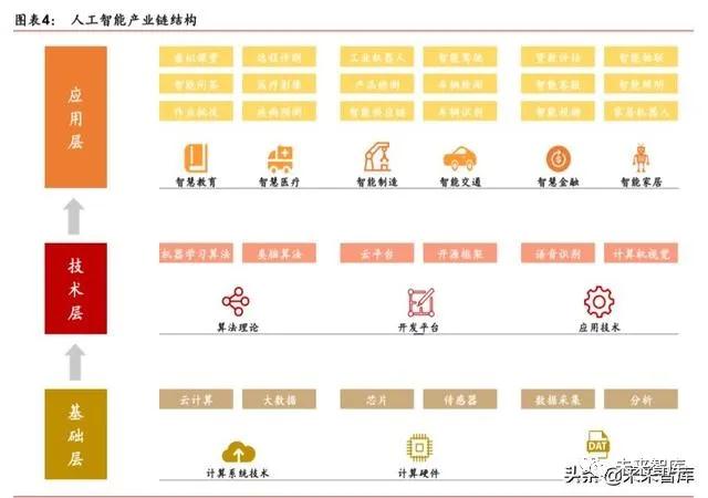 目前,人工智能產業的生態系統正逐步成型。依據產業鏈上下游關系,可以將人工智 能劃分為基礎支持層、中間技術層和下游應用層。基礎層是人工智能產業的基礎,主要提 供硬件(芯片和傳感器)及軟件(算法模型)等基礎能力;技術層是人工智能產業的核心, 以模擬人的智能相關特征為出發點,將基礎能力轉化成人工智能技術,如計算機視覺、智 能語音、自然語言處理等應用算法研發。其中,技術層能力可以廣泛應用到多個不同的應 用L域;應用層是人工智能產業的延伸,將技術應用到具體行業,涵蓋制造、交通、金融、 醫療等 18 個L域,其中醫療、交通、制造等L域的人工智能應用開發受到廣泛關注。