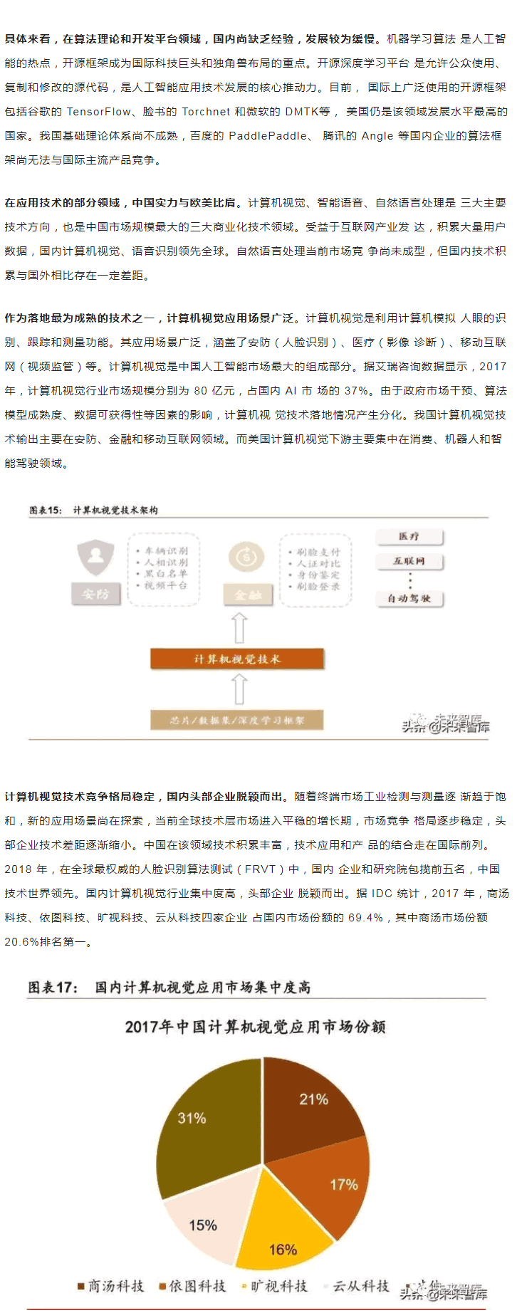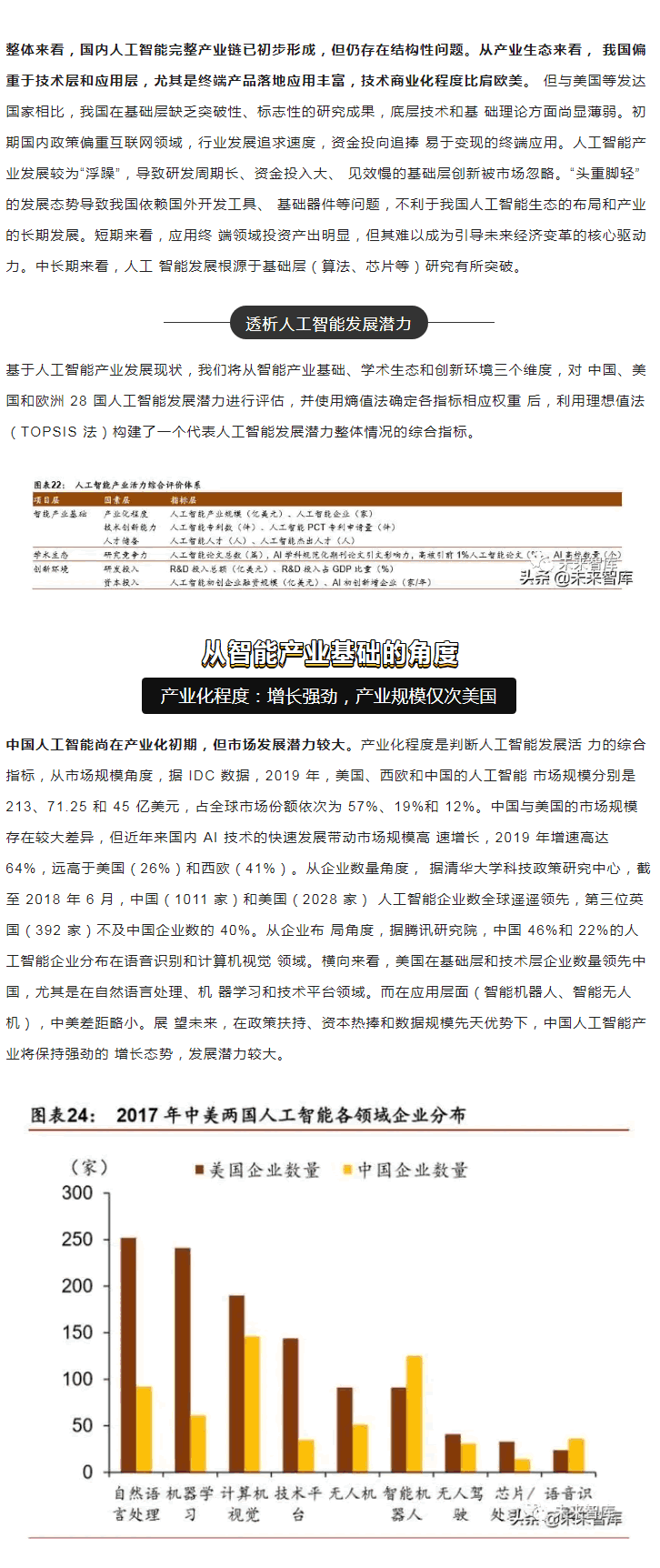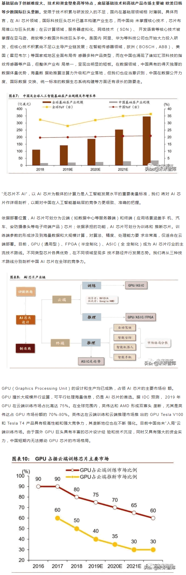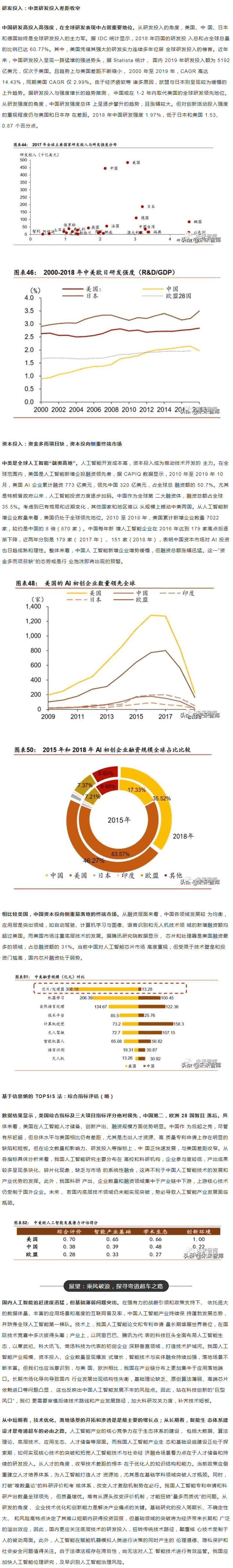 范圍內,中美“雙雄并立”構成人工智能D一梯隊,日本、英國、以色列和法國等發 達國家乘勝追擊,構成D二梯隊。同時,在D層設計上,多數國家強化人工智能戰略布局, 并將人工智能上升至國家戰略,從政策、資本、需求三大方面為人工智能落地保駕護。后起之秀的中國,局部L域有所突破。中國人工智能起步較晚,發展之路幾經沉浮。自 2015 年以來,政府密集出臺系列扶植政策,人工智能發展勢頭迅猛。由于初期我國政策 側重互聯網L域,資金投向偏向終端市場。因此,相比美國產業布局,中國技術層(計算 機視覺和語音識別)和應用層走在世界前端,但基礎層核心L域(算法和硬件算力)比較 薄弱,呈“頭重腳輕”的態勢。當前我國人工智能在國家戰略層面上強調系統、綜合布局。