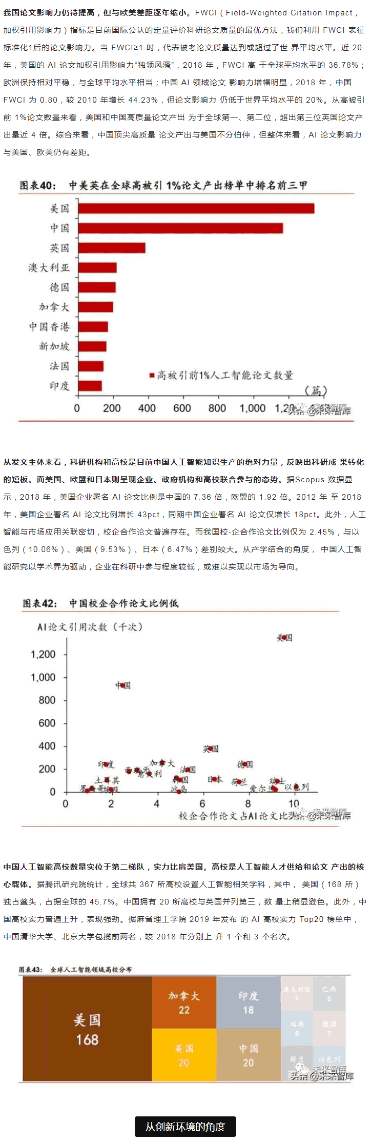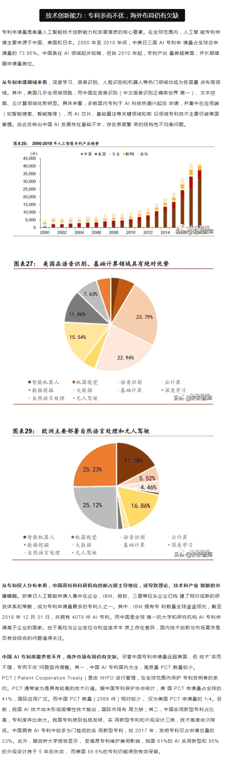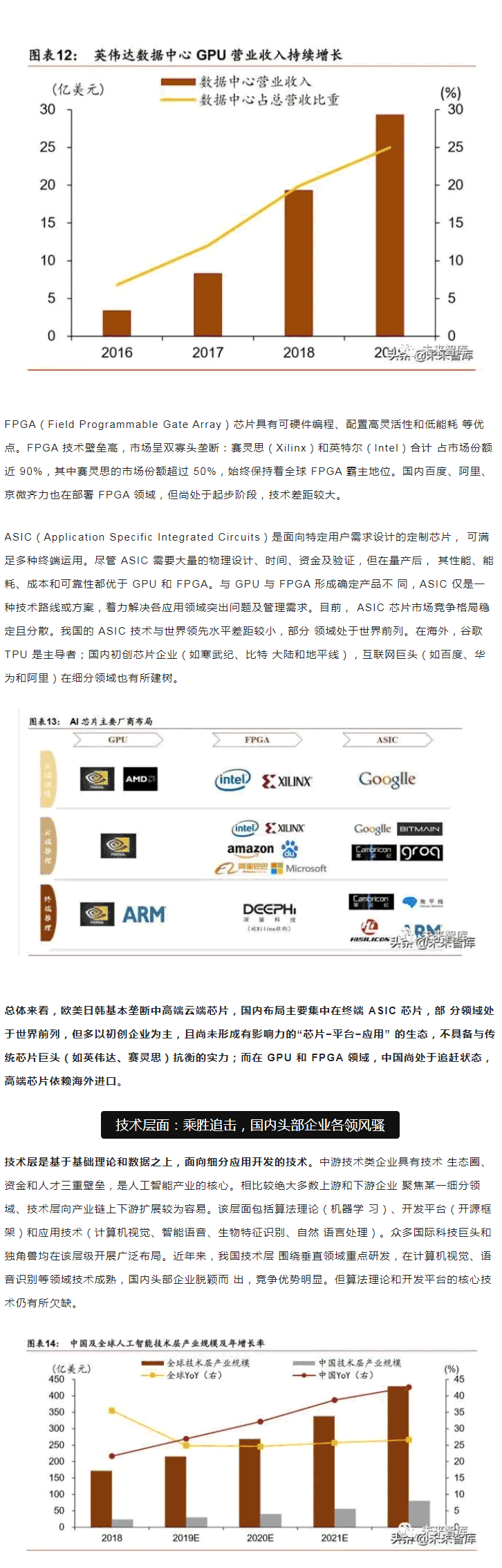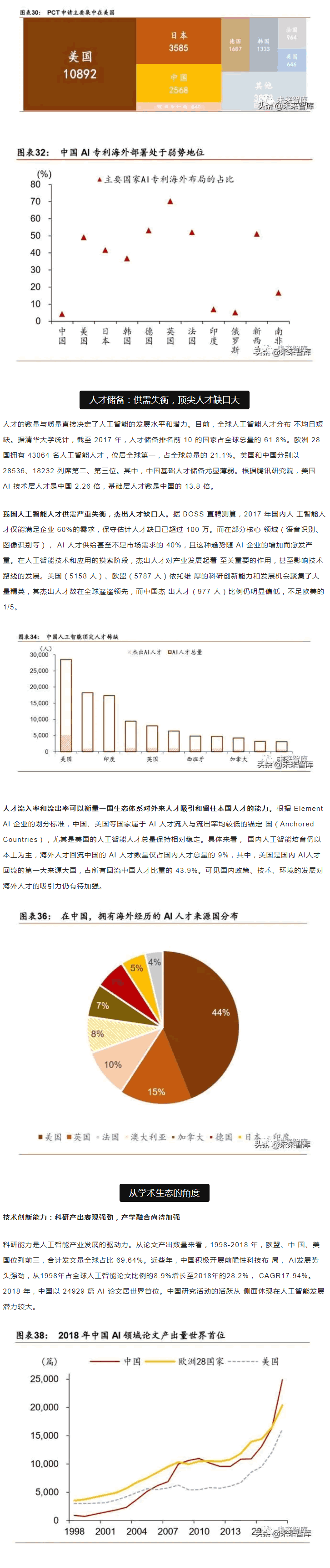 范圍內,中美“雙雄并立”構成人工智能D一梯隊,日本、英國、以色列和法國等發 達國家乘勝追擊,構成D二梯隊。同時,在D層設計上,多數國家強化人工智能戰略布局, 并將人工智能上升至國家戰略,從政策、資本、需求三大方面為人工智能落地保駕護。后起之秀的中國,局部L域有所突破。中國人工智能起步較晚,發展之路幾經沉浮。自 2015 年以來,政府密集出臺系列扶植政策,人工智能發展勢頭迅猛。由于初期我國政策 側重互聯網L域,資金投向偏向終端市場。因此,相比美國產業布局,中國技術層(計算 機視覺和語音識別)和應用層走在世界前端,但基礎層核心L域(算法和硬件算力)比較 薄弱,呈“頭重腳輕”的態勢。當前我國人工智能在國家戰略層面上強調系統、綜合布局。