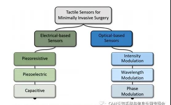應用于MIS的觸覺傳感器主要是基于電學或光學原理開發的。圖1顯示了基于傳感原理的MIS觸覺傳感器的種類。