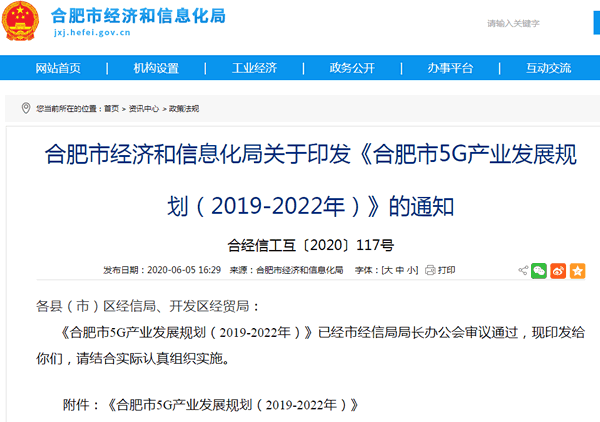 2020年6月1日,合肥市經濟和信息化局印發《合肥市5G產業發展規劃(2019-2022年)》。
