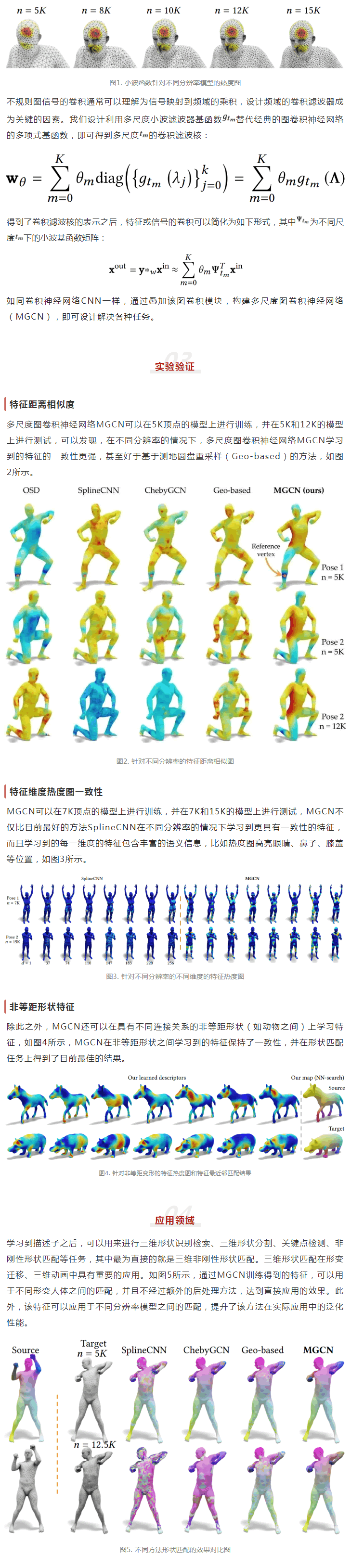 為解決現有圖卷積神經網絡的問題,團隊設計了一種多尺度圖卷積神經網絡(multiscale graph convolutional network,MGCN)。如圖1所示,我們發現,針對不同分辨率和連接關系的離散化,三維圖譜小波函數表現出J佳的魯棒性,并且不需要計算測地距離。因此,我們設計將多尺度的小波函數嵌入到圖卷積神經網絡的學習當中。