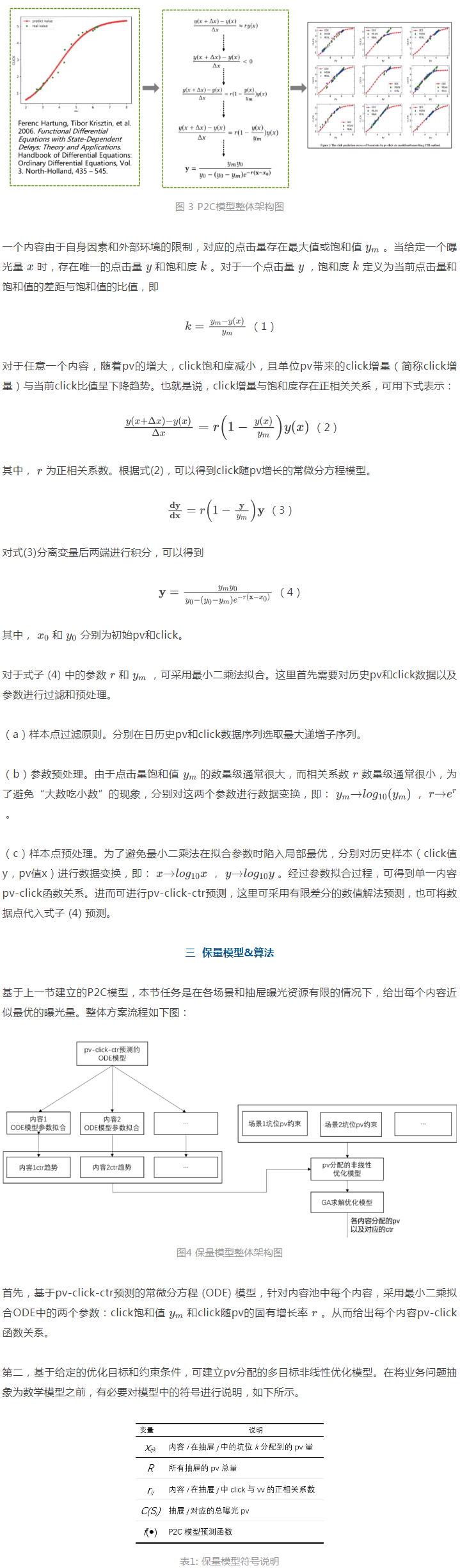 為內容分配曝光量涉及到關于曝光和點擊建模問題,以及內容的未來點擊量預測問題。內容曝光、點擊和播放等構成了一個復雜的非線性混沌系統,不僅取決于內容質量本身,也取決于內容更新時間、更新策略和用戶點擊習慣等。傳統的統計預測模型無法闡述外部環境的各種干擾因素以及系統的混沌特性,即無法從機理上描述系統本質。針對此問題,我們首先通過分析新熱內容的歷史曝光點擊日志,使用常微分方程建立了新熱內容曝光敏感模型,即pv-click-ctr模型(簡稱P2C模型)。在P2C模型基礎上,結合各場景和抽屜的曝光資源約束,給出一種曝光資源約束下的多目標優化保量框架與算法。