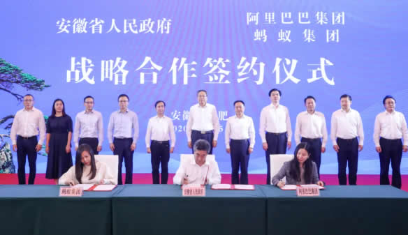6月15日下午,安徽省人民政府與阿里巴巴集團、螞蟻集團簽署戰略合作協議。省委書記李錦斌見證簽約。省長李國英、阿里巴巴集團董事會主席兼S席執行官張勇分別致辭。省委常委、常務副省長鄧向陽代表安徽省人民政府簽約。省委常委、省委秘書長陶明倫,省委常委、省委宣傳部部長、合肥市委書記虞愛華,螞蟻小微金融服務集團董事長井賢棟出席。副省長章曦主持簽約儀式。