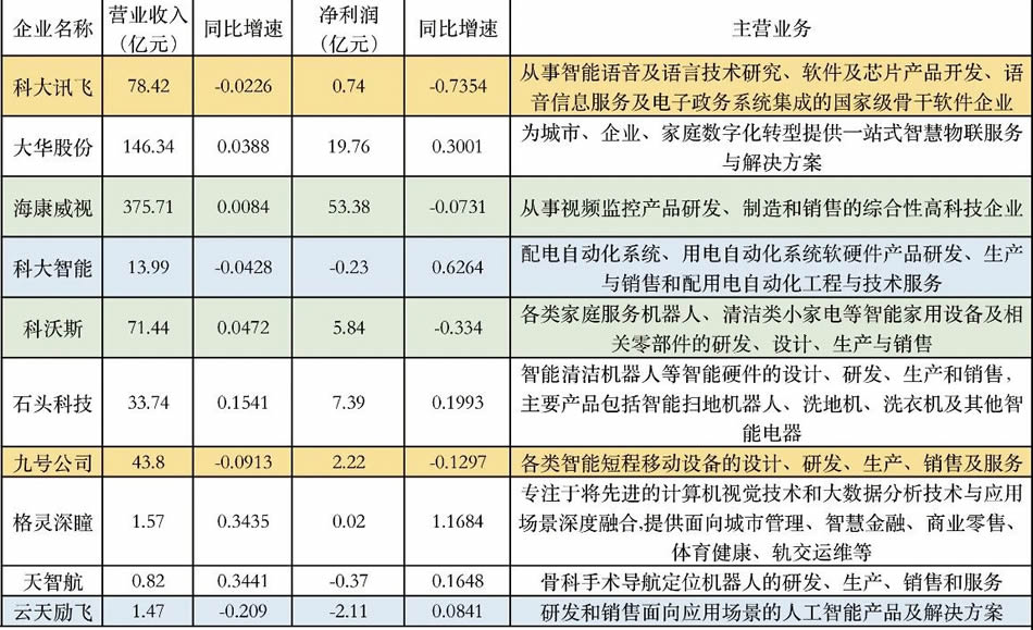 依然以營(yíng)收和凈利潤(rùn)兩個(gè)指標(biāo)來(lái)界定,4家雙增的企業(yè)有大華股份、石頭科技、格靈深瞳、天智航;2家雙降的企業(yè)有科大訊飛、九號(hào)公司;4家單降的企業(yè)有海康威視、科大智能、科沃斯、云天勵(lì)飛。