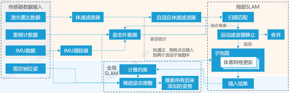 以谷歌開發(fā)的二維SLAM算法Cartographer為例:算法在前端完成占據(jù)柵格地圖的構(gòu)建,得出激光雷達(dá)掃描幀的佳位姿后,將掃描幀插入到子地圖中,得到局部優(yōu)化的子地圖并記錄位姿;后端根據(jù)掃描幀間的位姿關(guān)系進(jìn)行全局的地圖優(yōu)化,得出閉環(huán)掃描幀在全局地圖中的佳位姿。