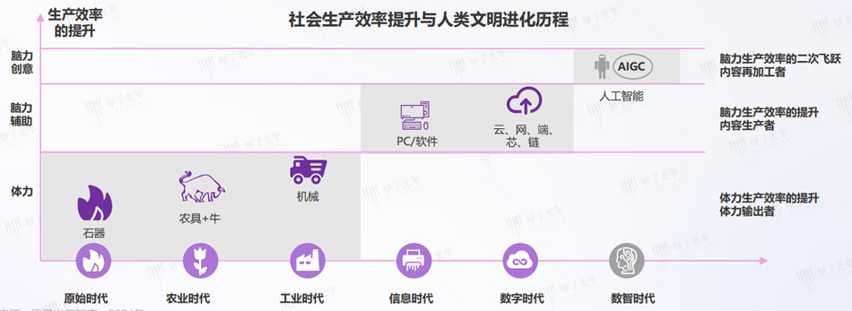 人類文明演進依次走過了原始時代、農業時代、工業時代、信息時代、數字時代,到今天的數智時代,每個時代的代表性生產工具都不同。所有 生產工具反映的都是生產效率的提升能力。數字時代的云、網、端、芯、鏈等數字工具,除了體力效率的提升之外,還有腦力效率的輔助作用, ChatGPT所代表的AIGC工具的出現,標志著人類生產效率出現了D二次腦力效率飛躍,是新一輪生產力的躍遷,真正實現從體力效率提升向腦力 效率提升的轉變,這將推動人類社會發生深遠變革,其意義不亞于新時代的蒸汽機。