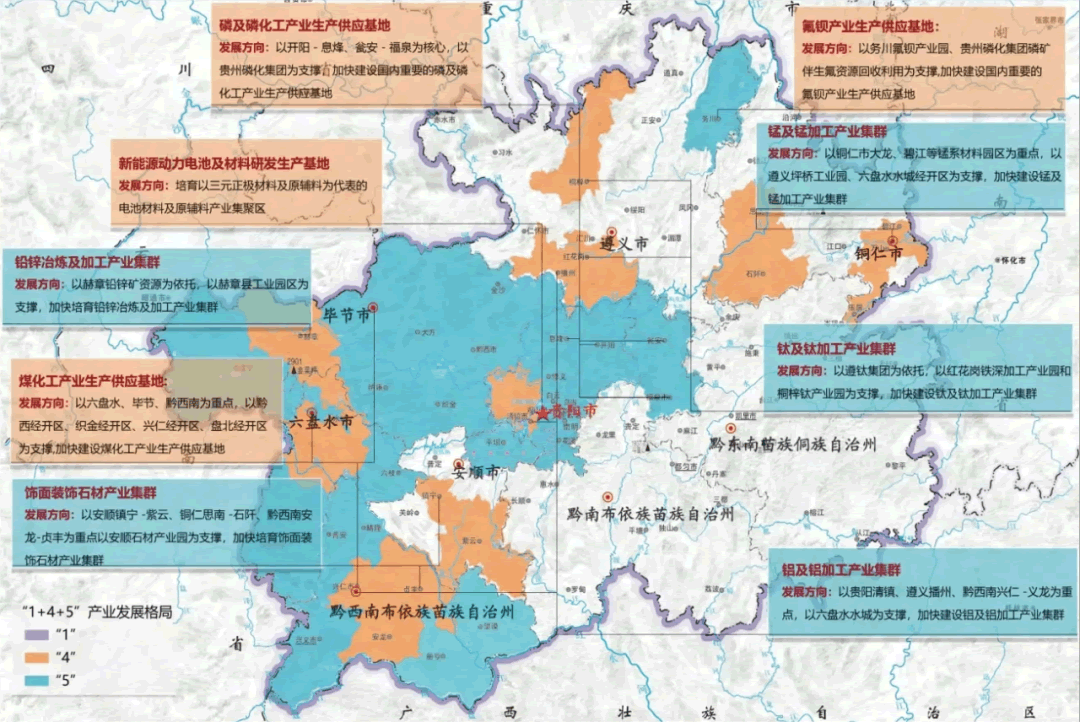 貴州省依托豐富的磷、煤、鋁、錳、金、重晶石、螢石等礦產資源,經過多年的發展,已經初步形成了以磷及磷化工、煤及煤化工、鋁及鋁加工、錳及錳加工、黃金、氟鋇化工等為主體的資源型產業基礎,行業重點龍頭企業包括貴州磷化集團、首鋼水鋼、中鋁集團等。在產業空間布局方面,貴州結合資源稟賦和產業基礎,圍繞建設全國重要的資源精深加工基地,努力構建“1+4+5”產業發展格局。