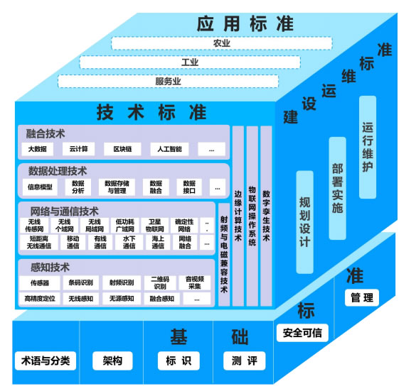 物聯網標準體系包括基礎標準、技術標準、建設運維標準和應用標準等4個部分,見圖1。基礎標準是物聯網的總體性、框架性標準,為其他各類標準提供基礎支撐;技術標準是物聯網的關鍵共性技術與融合技術標準,為實現物聯網應用提供技術支撐;建設運維標準是物聯網系統規劃、建設、運行、維護的標準,以指導各行業推進物聯網系統建設和規模化部署應用;應用標準是面向行業具體應用需求,對其它部分標準的細化,支撐各行業發展。