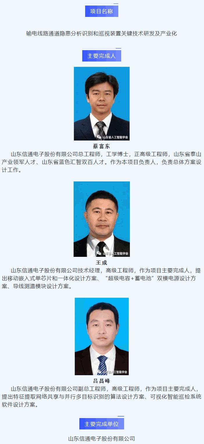本項目屬于人工智能L域,在山東省重大科技專項、企業(yè)自主項目的支持下,經(jīng)過5年持續(xù)努力,引入人工智能技術解決了以上行業(yè)難題,取得了系列成果:(1)首次提出了基于人工智能圖像識別技術的輸電線路隱患圖像分析方法,解決了人工識別工作量大、效率低的難題;(2)首次突破了在線監(jiān)測裝置及系統(tǒng)規(guī)模化應用的主要技術障礙;(3)首次提出了評價處置到位程度的定量計算方法,開發(fā)了告警接收、處置安排及消警反饋的移動智能巡檢終端及其APP應用,融合人工智能、移動應用的可視化遠程巡檢系統(tǒng),實現(xiàn)隱患實時監(jiān)測、智能分析、預警推送和快速處置的全流程閉環(huán)。