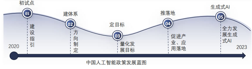 自2019年以來,中國緊跟人工智能產業發展,從建立體系框架、制 定指標到推動場景落地,逐步夯實發展路徑,建立了扎實的政策環 境和產業基礎,為生成式AI的發展奠定了堅實基礎