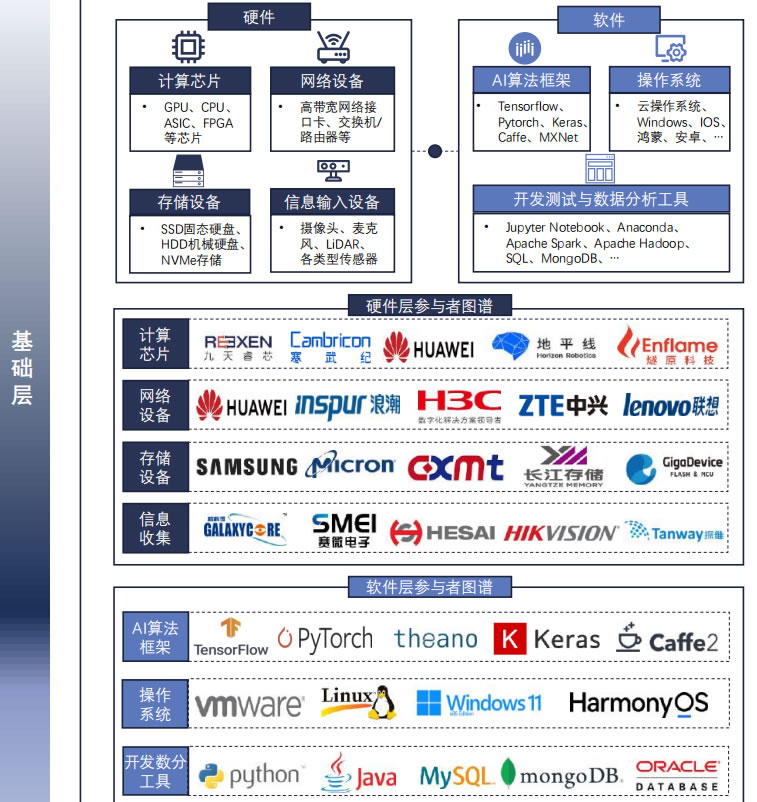 人工智能基礎層涵蓋計算芯片、網絡設備、存儲設備和信息采集設 備,以及操作系統、開發測試分析工具和AI算法框架,共同構成了 人工智能產業發展的基石底座