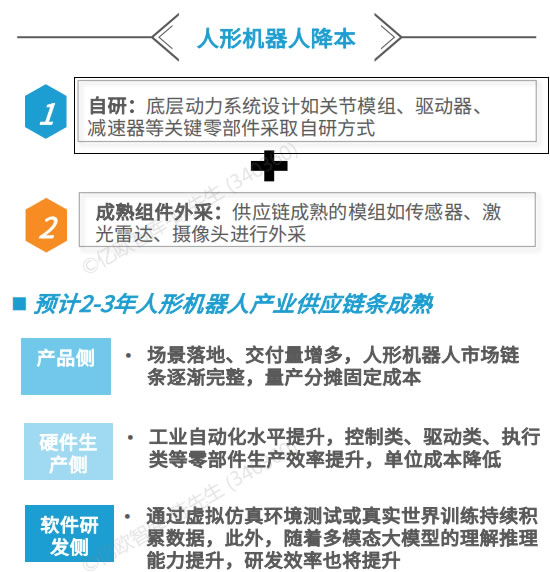 人形機器人降本是確定趨勢,供應鏈成熟與否是實現降本重中之中,未來人形機器人產業供應鏈也會趨向智能手機發展,達到生態成熟、規模量產 且成本可控的狀態。