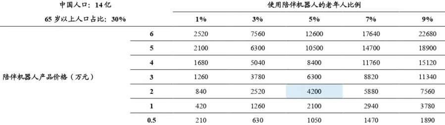 陪伴機(jī)器人在中國(guó)老年人群中的潛在市場(chǎng)需求為4200億人民幣。 核心假設(shè):