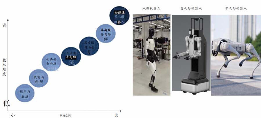 國內(nèi)機器人大多瞄準(zhǔn)三類下游進(jìn)行布局,產(chǎn)品形態(tài)由非人形到類人形逐步拓展至雙足人形。人形機器人可
