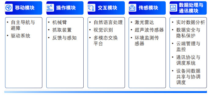 模塊化設(shè)計(jì)通過(guò)將機(jī)器人系統(tǒng)分解為多個(gè)軟硬 件模塊 ,廠商和用戶(hù)可以根據(jù)不同的應(yīng)用需求 進(jìn)行靈活組合和定制。這一設(shè)計(jì)理念不僅提升 了產(chǎn)品的適應(yīng)性和可擴(kuò)展性 ,還為技術(shù)的創(chuàng)新 與產(chǎn)品的迭代提供了可能性 ,是開(kāi)放性的全棧 式智能服務(wù)機(jī)器人生態(tài)系統(tǒng)的基石。服務(wù)機(jī)器 人模塊化設(shè)計(jì)以多個(gè)軟硬件模塊——移動(dòng)模 塊、操作模塊、交互模塊、傳感模塊和數(shù)據(jù)處 理與通信模塊為核心。通過(guò)這種靈活的設(shè)計(jì), 服務(wù)機(jī)器人能夠大大提升在不同場(chǎng)景中能夠靈活應(yīng)對(duì)復(fù)雜任務(wù)的能力。